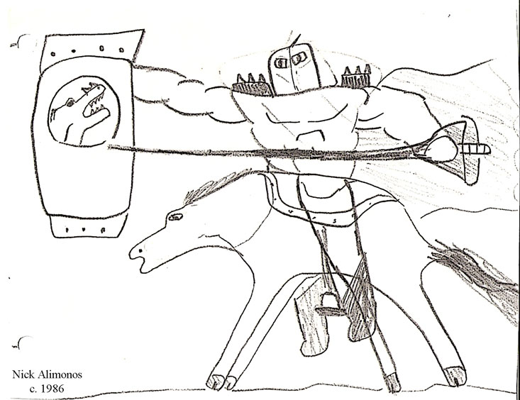 They finally reached the Enchanted Mountains knowing the enemy was near. They drew their swords, prepared for battle, and soon saw the Deckronian Knights rushing to attack them. Sint and Thangar clashed swords and started sword fighting. Sint took on twenty men while Thangar, being the better warrior, took on thirty. Their powerful swords slashed the guards’ defenses, cutting the enemy shields and swords in two. Weaponless, but still with armor, the evil knights fled. Thangar slashed through their armor, killing them before they could return with more weapons. The knights were obviously outmatched. But then they sent their jousters in to attack. But, just like the knights, their spears were slashed and they were knocked off their horses. Even the jousters were useless.