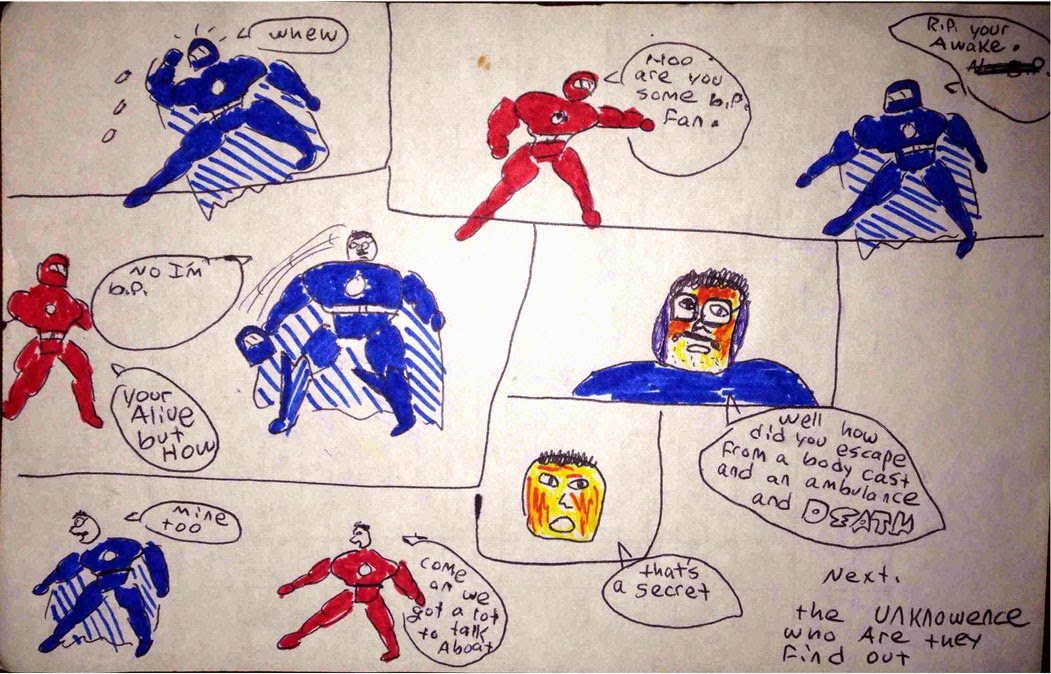 On the surface, Panther and the Bull is a simple story, two superheroes teaming up against a Hulk/Minotaur type villain. But I was dealing with a lot of shit at the time. Since my parents were far too busy to realize I existed, and my brother just wanted to go out drinking and looking for one-night stands, I was utterly alone, but for a pizza cook named Dean. For reasons I cannot fathom, this stranger from Illinois, someone who lived in his van and who, I later learned, was also a cocaine addict, was everything my father wasn’t. He listened to my stories and problems; he read to me and encouraged me and helped out with homework; he even took me to the movies and the arcade. I am a better father because of him. But he could not play the role forever. I begged him to stay, telling him that he was “my lifeline,” the only person in my life that cared, but he had to move back to Peking, regardless. I was devastated. It was like losing my best friend and father all at once.
