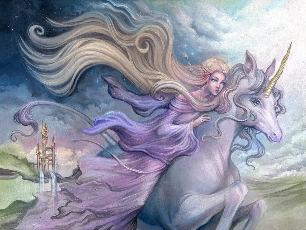 A beautiful new cover is on its way for The Princess of Aenya! While I was completely happy with the old pic, I wanted to give my book a bit of a facelift after receiving rave reviews from IndieReader and Kirkus Magazine. If you’re not in the know, the good folks at IndieReader gave my book a 4.7 out of 5 stars, calling it a “great book, period” while Kirkus included Princess on their list of “20 Great Books Worth Discovering.” This is something I really wanted to share with prospective readers, so I decided on a new cover to showcase what critics have been saying, and I figured, if I was going to go all out, I might as well do something new and exciting. You may remember Becky Barnes’s wonderful unicorn illustration from the back flap and the interior. Well, after a good four months, she sent me this stunning new piece, featuring the titular Radia racing from her Compass Tower atop her trusty unicorn, Amalthea. What took so long, you ask? Simply this: it’s a real painting, using real paints splatted onto a real canvas, which, I think, gives the book and the story a more authentic, old-world feel. I really love it and hope you will too!