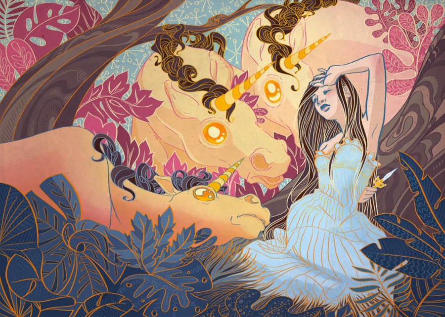 He continued down to the foot of the Great Eastern Gate, and the bridge spanning the divide between the two hemispheres. The colossal arches were worn by wind and sun and the ravages of time, overgrown with blazing stars and chicories and perennials. On the north flank, the stone creature rising from the base had collapsed into a mound of rubble, leaving only its hindquarters, but on the southern end, Hugo could make out the semblance of a bucking horse, dressed from hoof to snout in green creepers, with a single horn spiraling up from the head like a conical lance broken at the tip. He stood fretfully upon the landing, overlooking the sheer drop of the Tectonic Chasm. It was like peering beyond the end of the world, the bridge crossing the divide vanishing into the gray ether. Whether he could continue along the expanse until reaching the eastern half of the world, he could only guess, but the distance, he knew, was many leagues. Turning north to the Celestial Hill, he observed the Compass Tower, which loomed like a gilded spear rising from a white fist. His impatience growing, he tried to gauge how far the violet moon had traversed across the broad face of the greater turquoise disc, and his eyes drifted again to the statue of the unicorn, to the standard of his people. He had only chanced to see the animal once in his youth, on guard duty at the royal stable, and did not know whether other such creatures existed, only that the one he was fortunate enough to have witnessed was hundreds of years old. Legend had it that the thirty-third descendant of the first king, Queen Lumina, was so pure of heart, that after she had fallen asleep in a neighboring glade, a unicorn came to rest its head on her lap. The divine creature became enamored by the princess’s charm, and in time came to dwell with the royal family. And so the embodiment of the sigil Hugo wore on his breast remained, upon centuries, among the king’s equine stock.