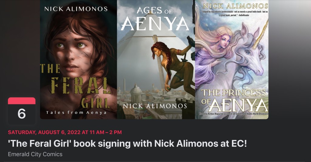 I’ve attended two signings this year, one at the Oxford Exchange in Tampa and another at Cypress Cove near Orlando. Now, I’ll be at Emerald City in Pinellas Park, FL. If you haven’t been there, you really should check it out. It’s a warehouse-sized comic mecca; they sell everything from vintage issues of Superman to life-size Batman statues to every role-playing game supplement you can imagine. While they don’t normally carry novels, the owner let me showcase my stuff on their shelves, and the books have been selling like hotcakes since. In fact, he’s been so impressed with the Aenya Series’ capacity for making him a sale, he’s started a no-pictures book section. So if you’d like to meet me in person, pick up a signed copy of The Feral Girl, or get some free bookmarks, be sure to head over to Emerald City this coming Saturday, August 6th!