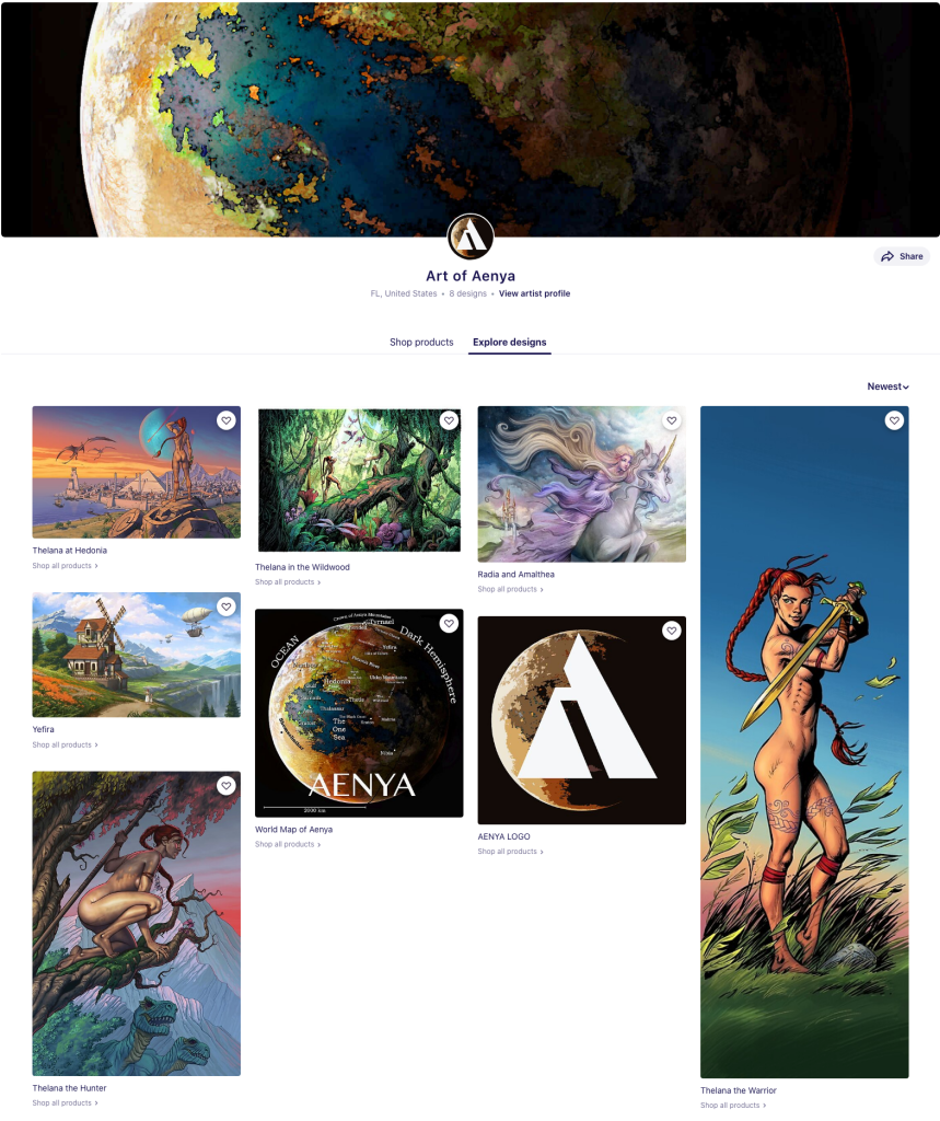 Have you ever wanted an Aenya-themed coffee mug with the Aenya logo featured on the cup? How about Thelana wielding her golden sword from the back of your iPhone? Or even a bedspread? You know, the famous one with our intrepid heroine crouched in the treetops, spear in hand, ready to hunt some tyrant dinosaurs? Or a shower curtain featuring Radia’s flight atop her trusty time-skipping unicorn, Amalthea?