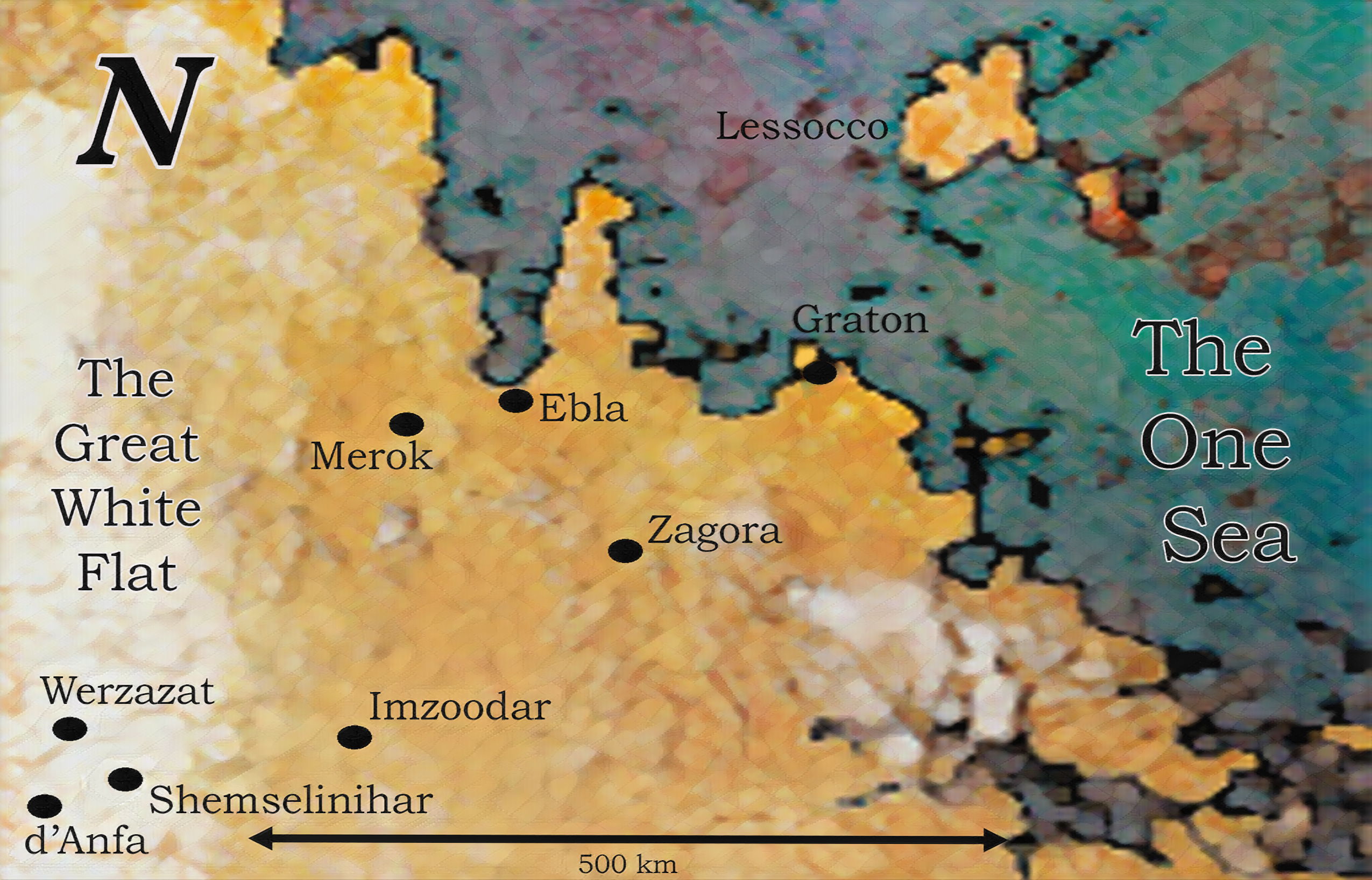 This is a rough map of the area featured in the story. The novel starts from the small port town of Graton and continues southwest through The Great White Flat, concluding in Shemselinihar, the Oasis City, the Blue City, City of Ten-Thousand Doors. I will be hiring someone to produce a more professional-looking map later on, but this is just to give you an idea of what is to come.