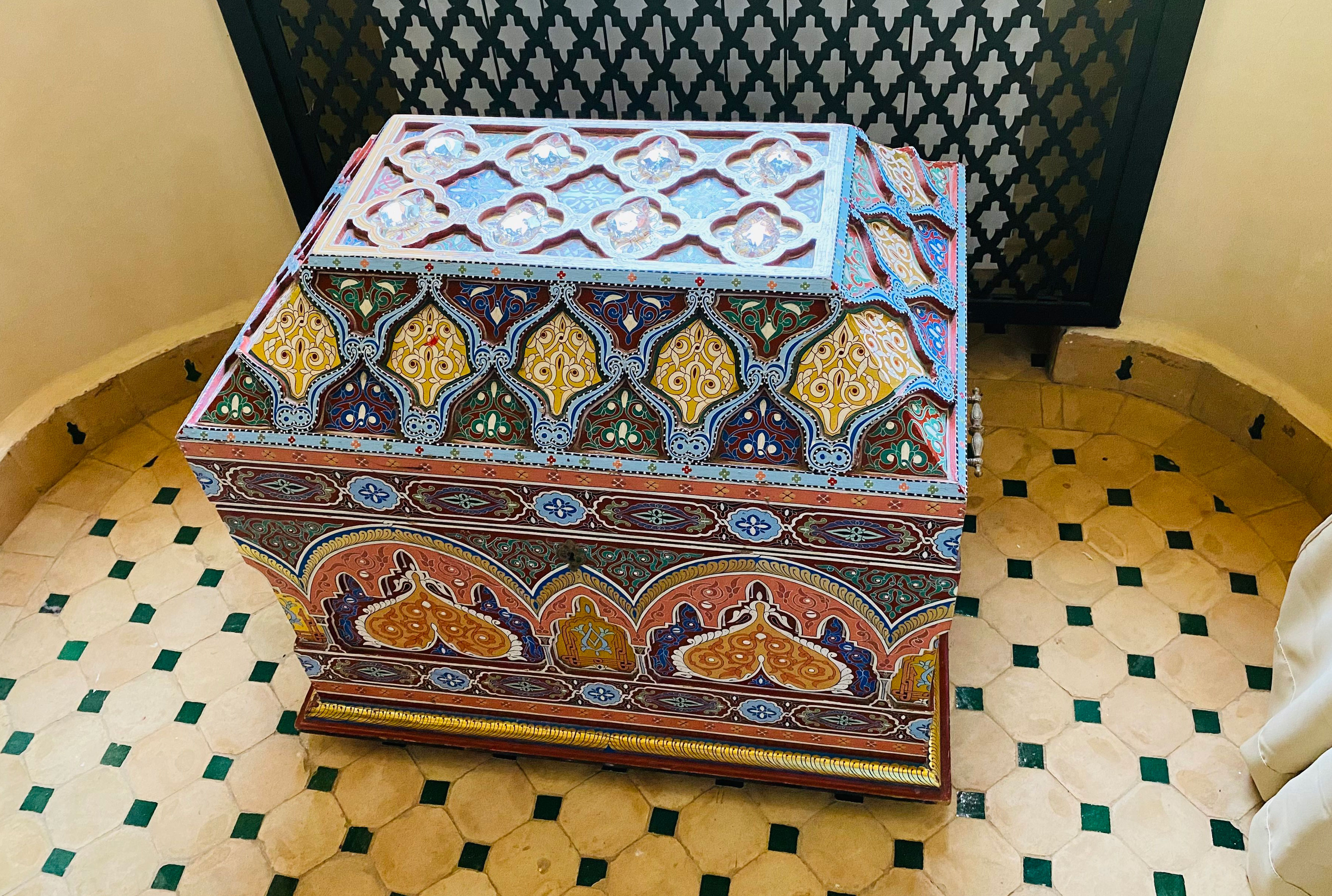 Morocco is a treasure trove for writers of the imagination, and Shemselinihar would not feel as authentic without my having spent so much of my time there. This ‘treasure’ chest (below) is a fine example of the kinds of wondrous items to be found in Marrakesh. It’s something Rose stumbles across after mysteriously waking in the guest bed of Sekhmet’s uncle, Hamza. Plot-wise, it’s a minor detail, but enough to give you a sense of the culture.