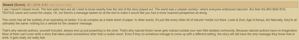 Now, here’s the thing: I actually 100% agree with this person. While I occasionally enjoy books and movies featuring nude or naked characters, I do not take them seriously. I do not consider them anything more than a guilty pleasure. In fact, the criticisms this person makes about ‘nudist media’ are all things I’ve said myself. I’ve even gone a step further by stating that I don’t consider ‘nudist books’ fiction. So this leads me to wonder — WHY IN THE HOLY FUCK is my book included in this comment???